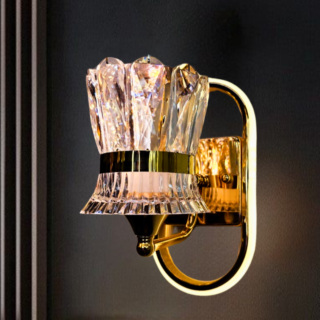 - DESIGN: Elegant crystal wall sconce featuring a luxurious gold-plated metal base and intricately cut crystal shade for sophisticated illumination