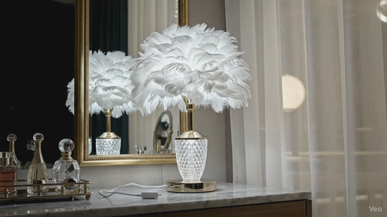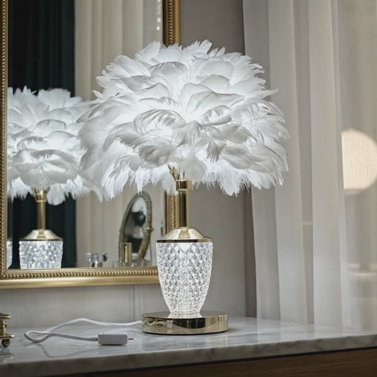 Wrap your space in soft, dreamy light with the Aurora Feather Luxe Table Lamp, a statement piece that feels like a cloud glowing on your bedside. Layered white feathers diffuse a warm, soothing glow, while the crystal-textured base and gold detailing add unmistakable luxury to your room.