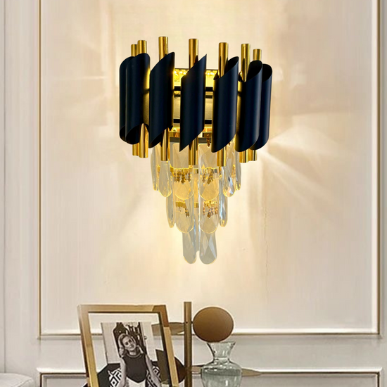 DESIGN AESTHETIC: Luxurious wall light fixture featuring a sophisticated combination of black metal panels and gold-finished accents for modern elegance